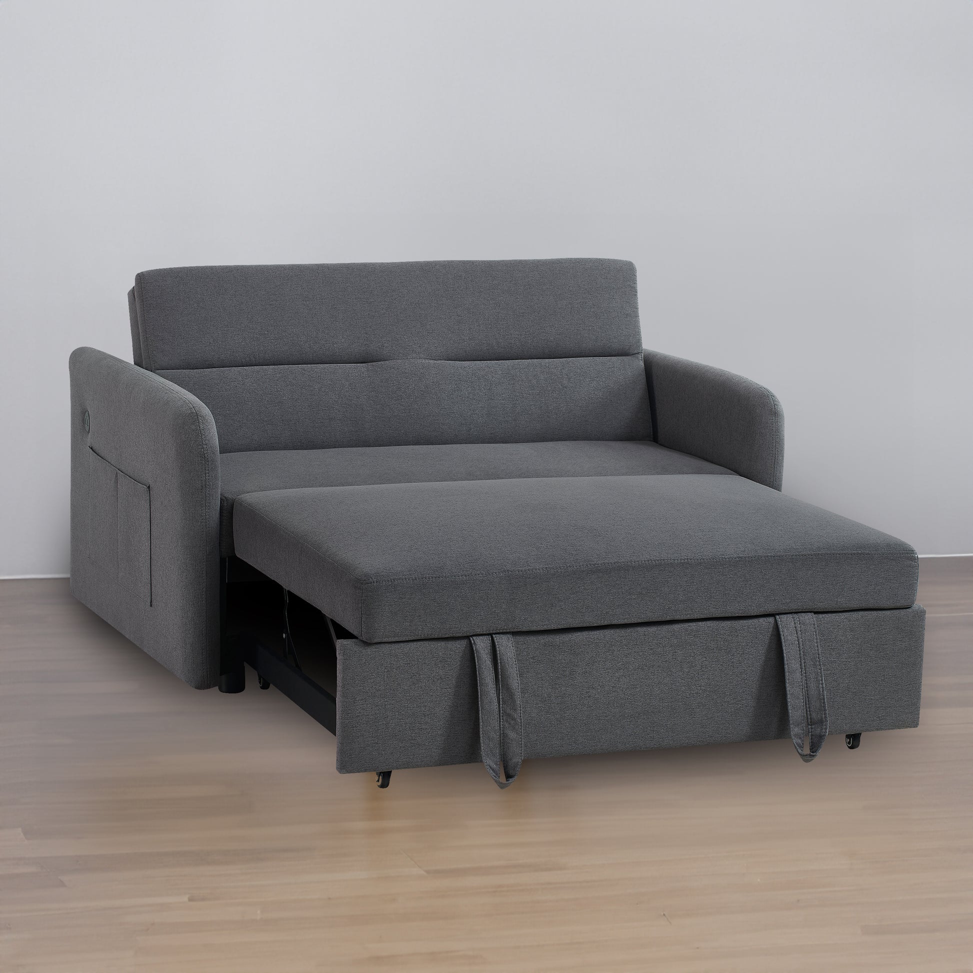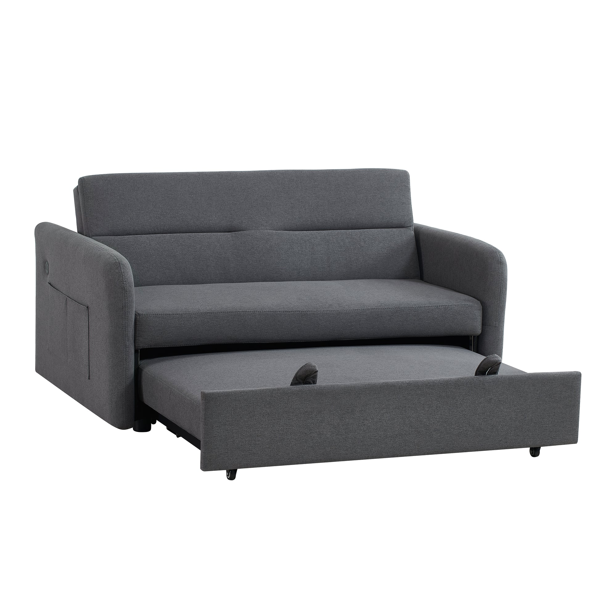 Divano letto convertibile con sistema pull-out, presa USB integrata e supporto a molle. Perfetto per soggiorno, monolocale e camera ospiti. Design moderno in tessuto grigio.