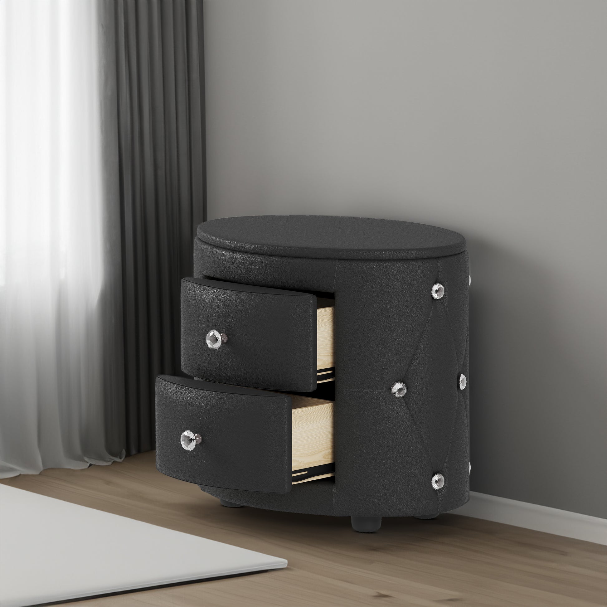 Comodino Nero Ecopelle Maniglie Cristallo