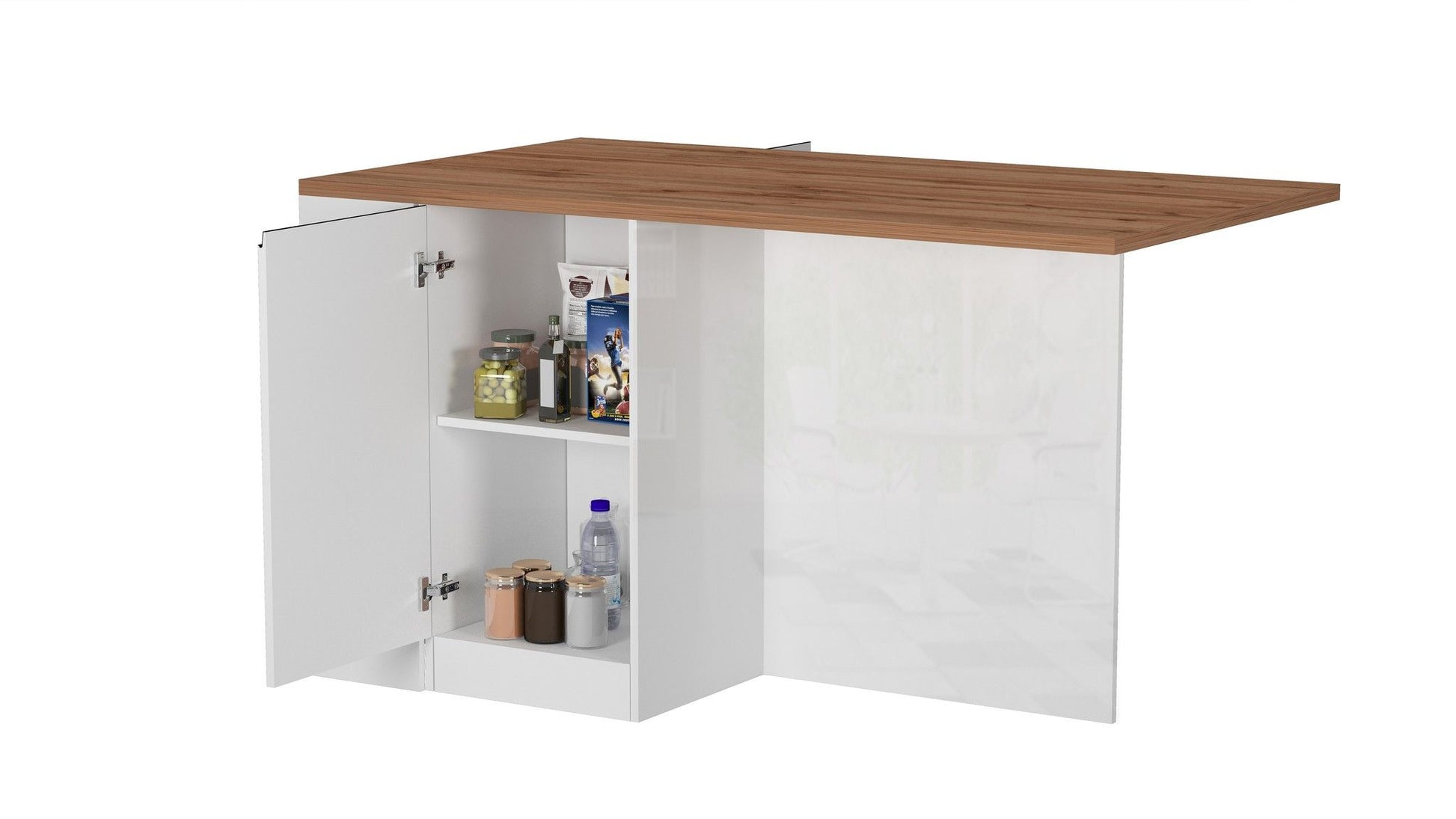 - L’isola SOLE con 2 ante e vani a giorno è un elemento versatile e funzionale, perfetto per svolgere diverse attività in cucina. Utilizzabile sia come tavolo da pranzo che come dispensa, offre una pratica superficie per la preparazione dei pasti e uno spazio per riporre e conservare gli utensili da cucina e le provviste.