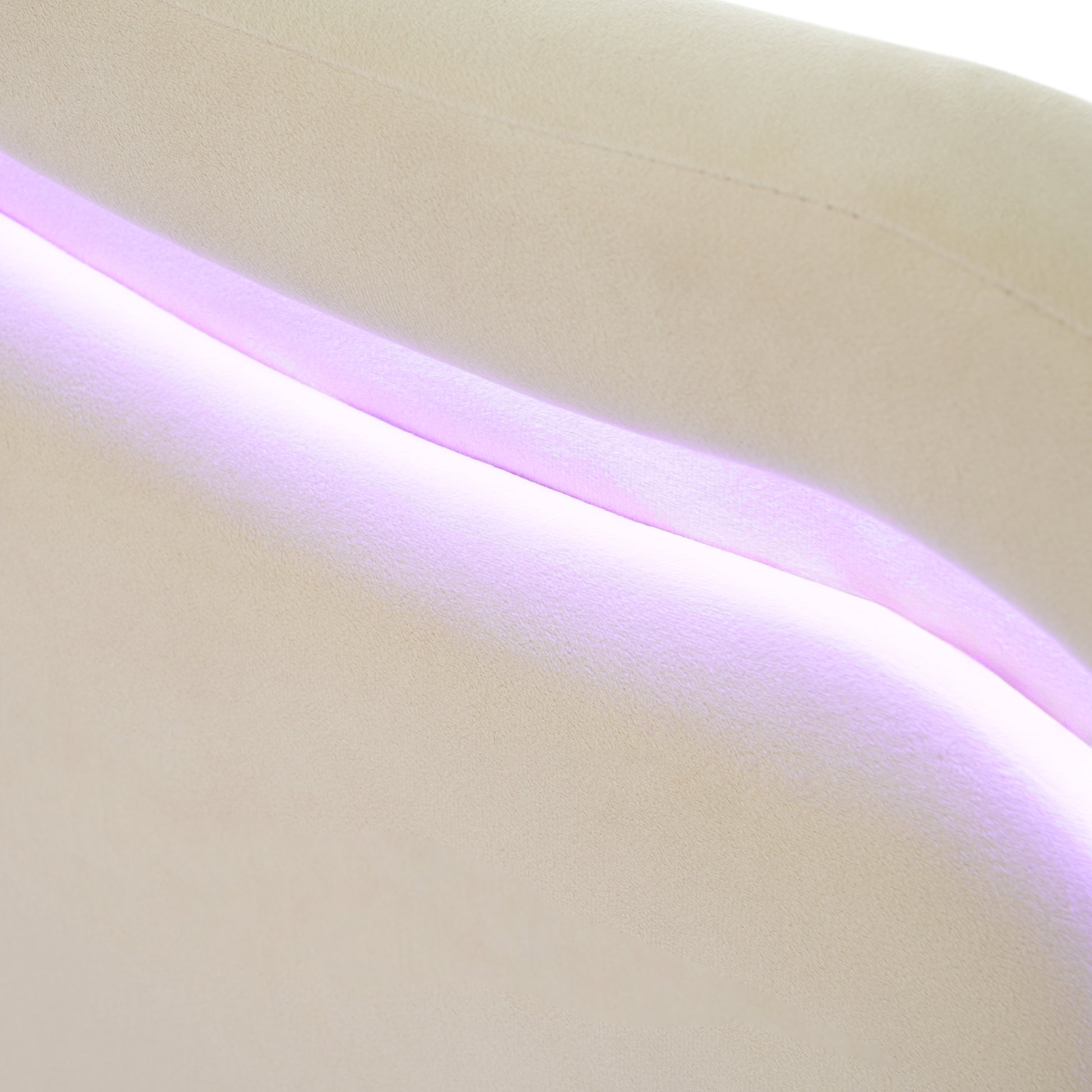 Letto imbottito in velluto beige con illuminazione LED RGB integrata, testiera regolabile in altezza e supporto robusto. Senza bisogno di rete. Facile montaggio.