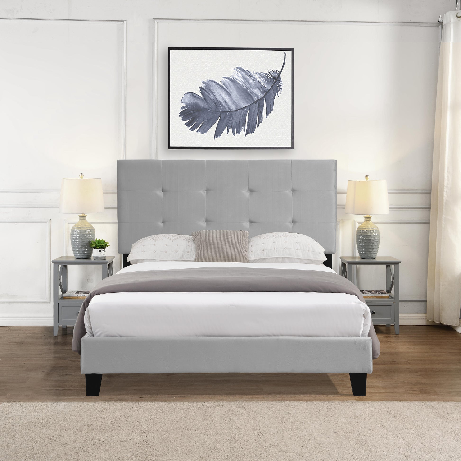 Letto platform in velluto grigio con testiera capitonné, doghe in legno robuste e design moderno. Senza bisogno di rete. Facile montaggio.