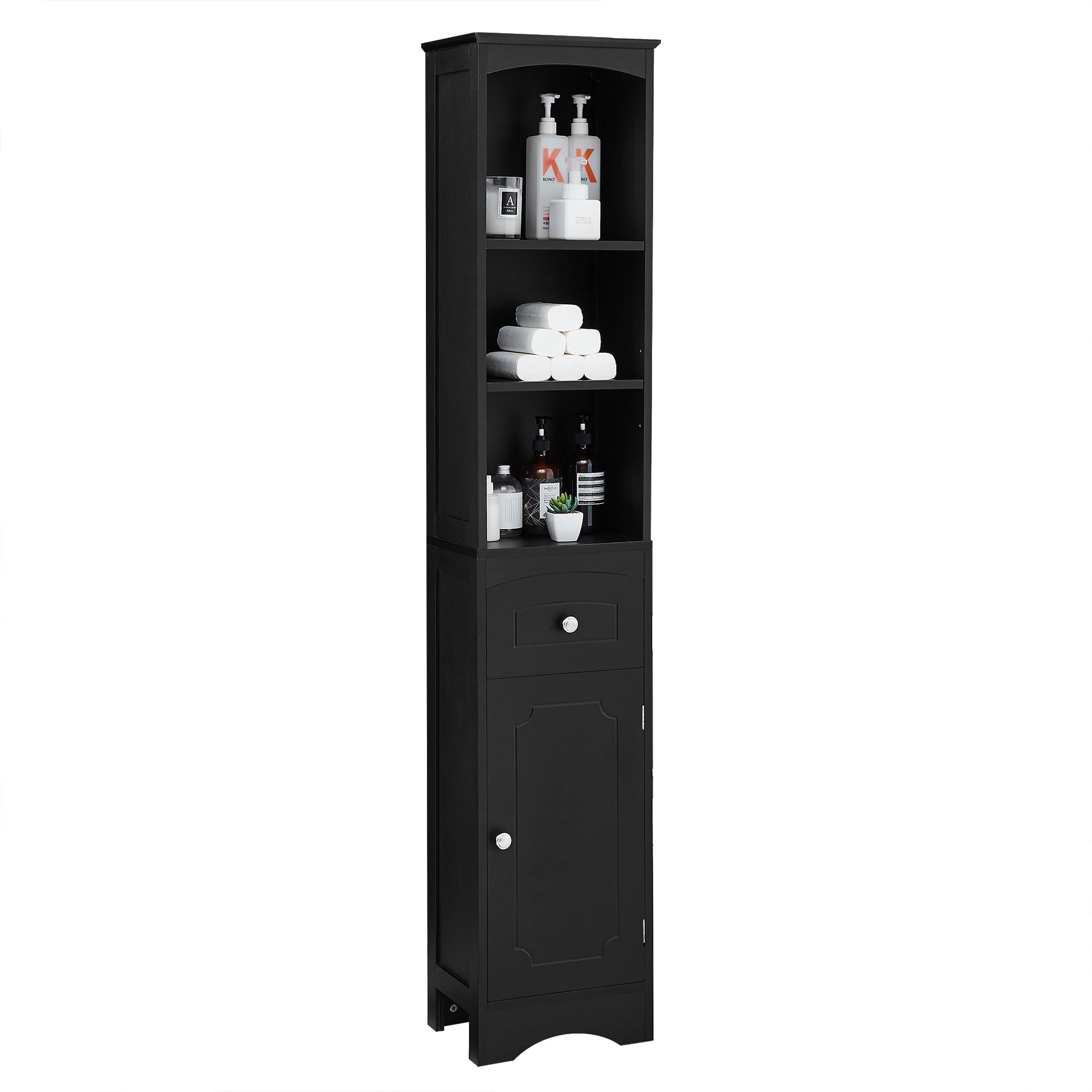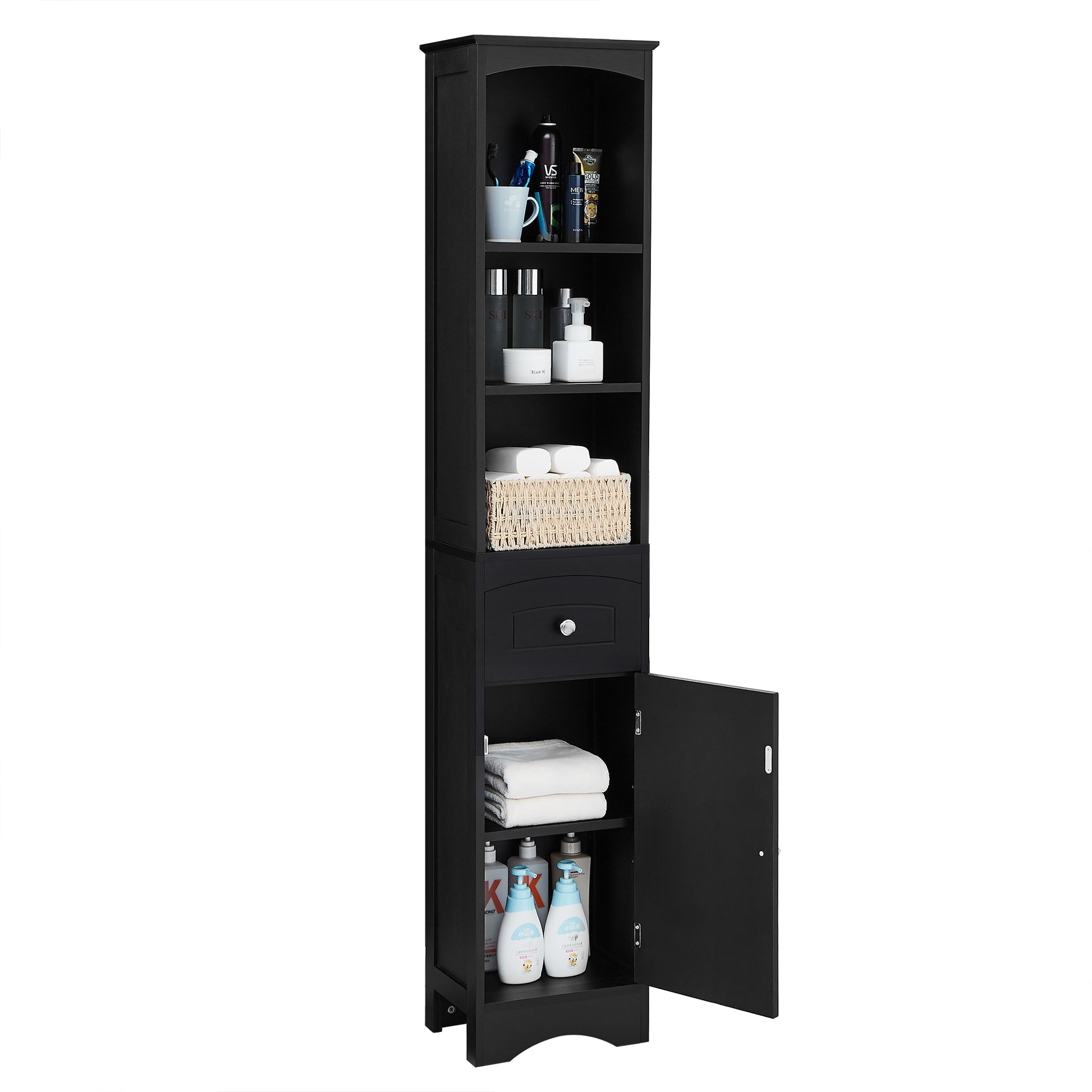 Mobile bagno salvaspazio stretto con 3 mensole aperte, 1 cassetto e 1 anta con mensola interna. Design moderno nero elegante.