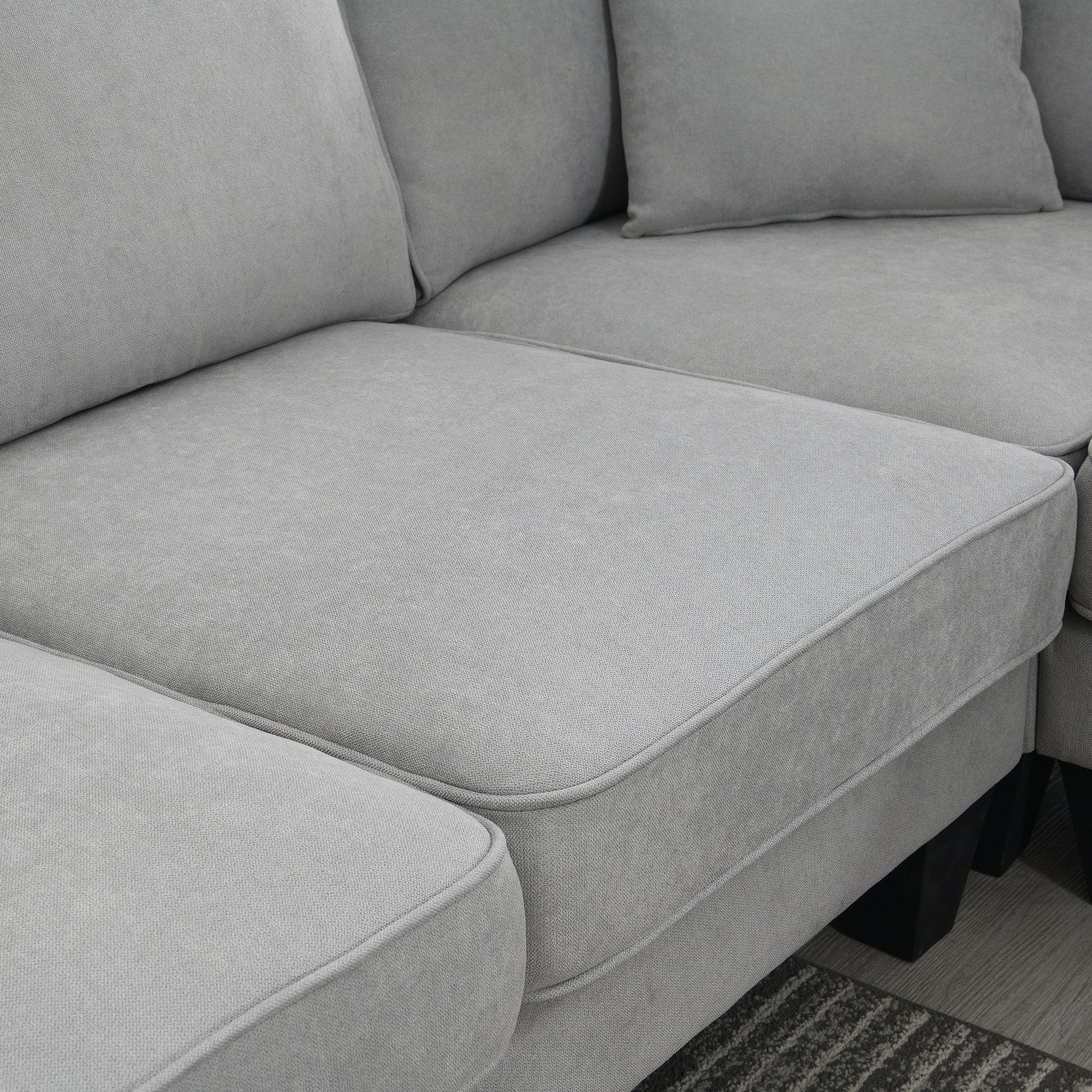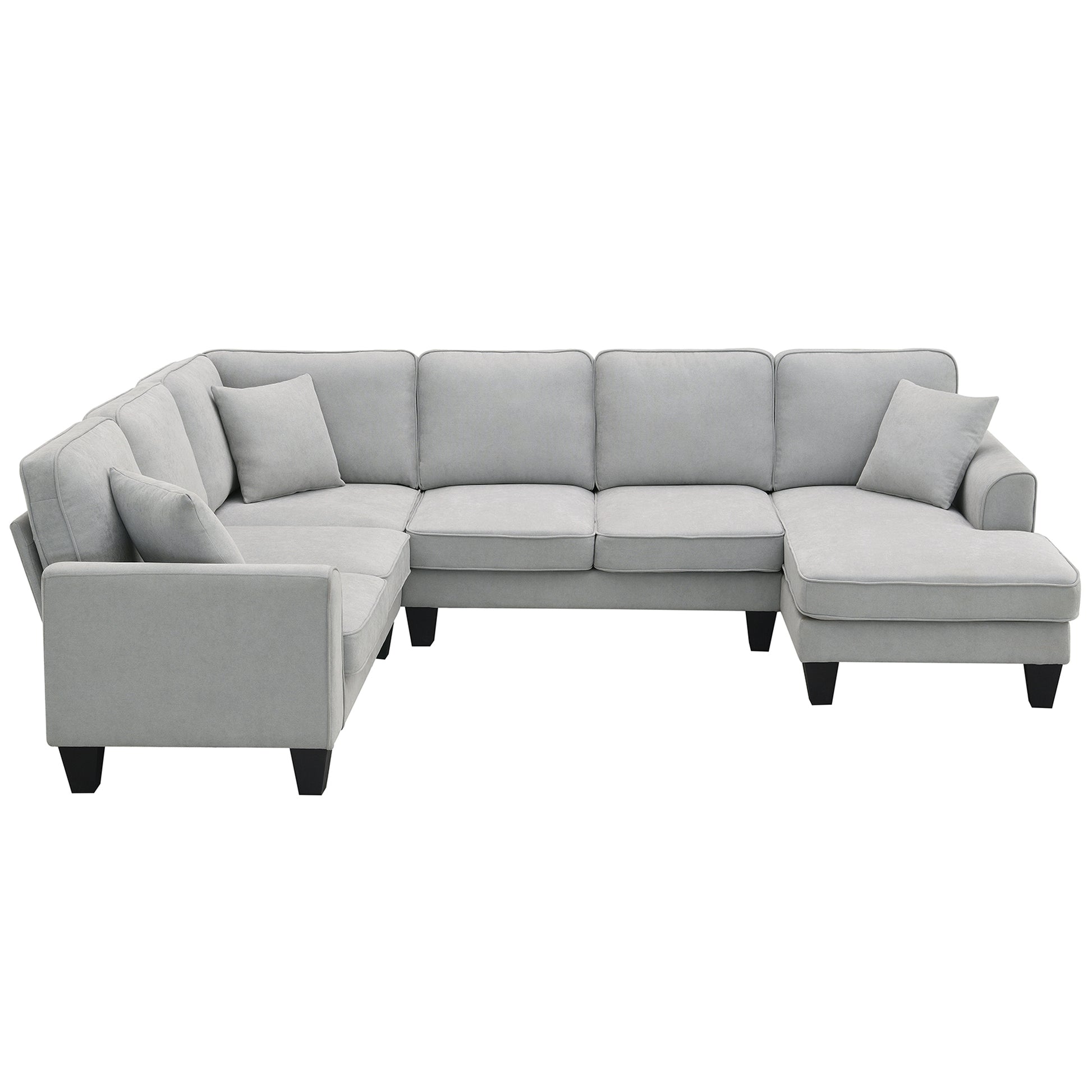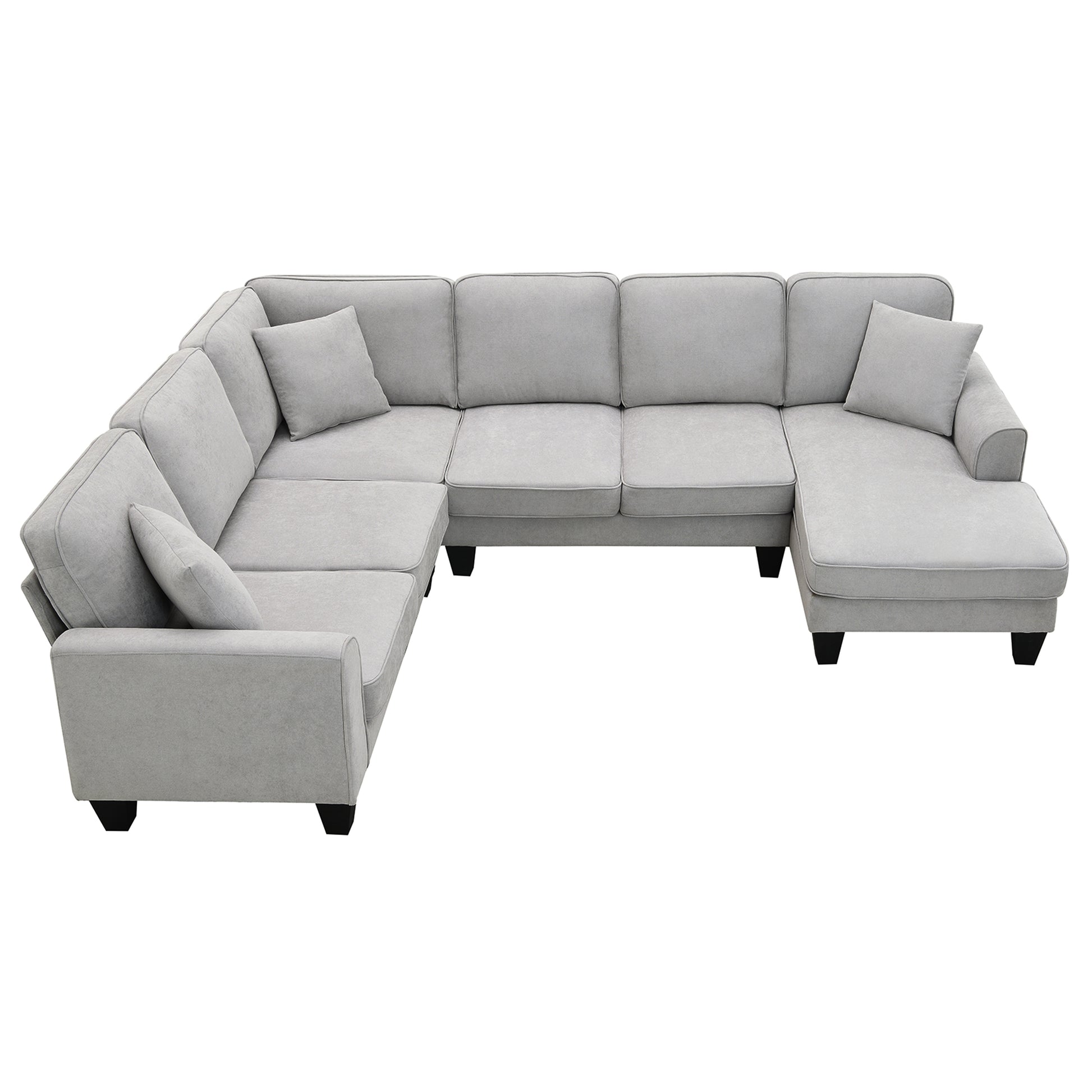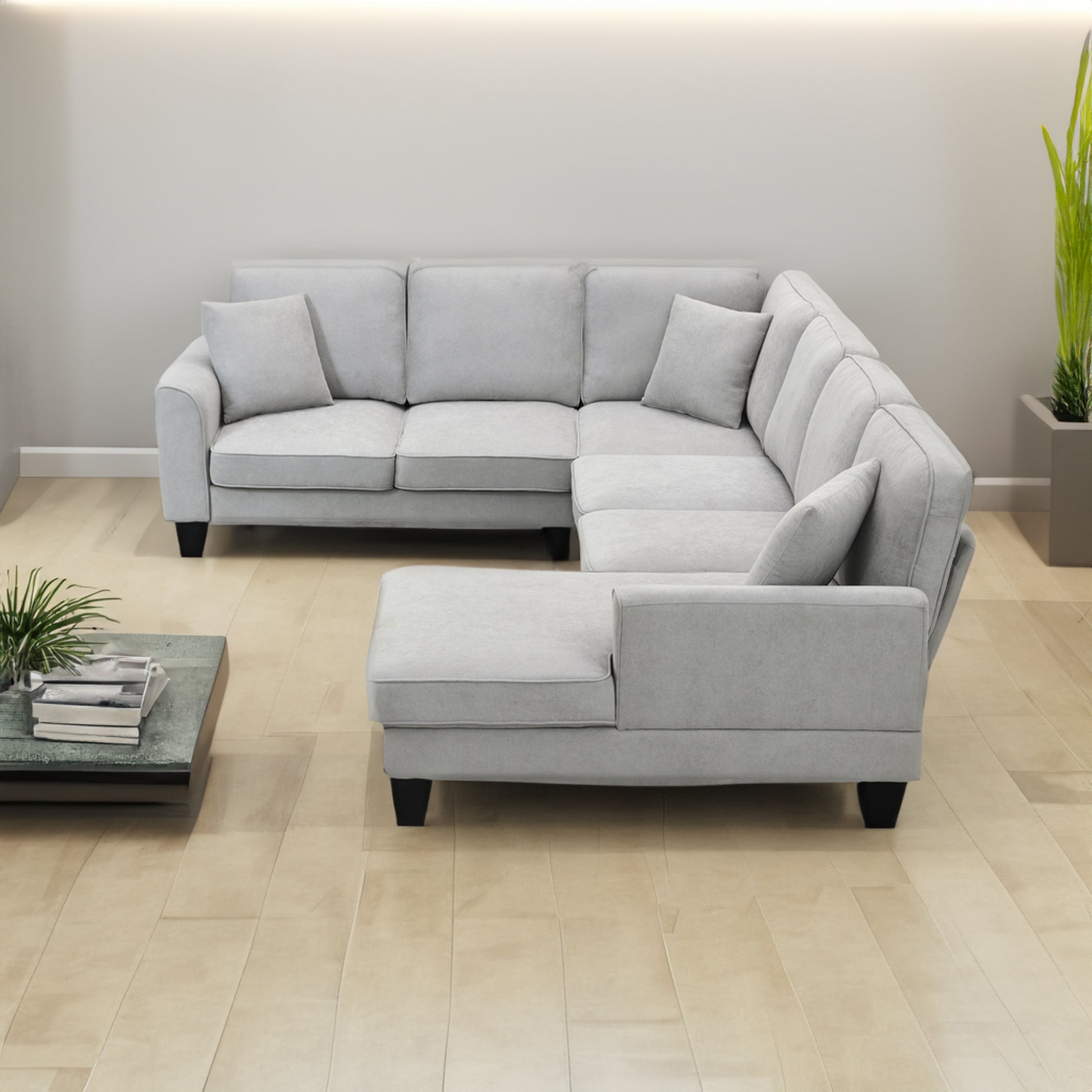 Elegante divano sezionale a forma di U da 7 posti in tessuto grigio chiaro. Design modulare componibile con struttura robusta in legno massello e ferro. Include 3 cuscini decorativi per comfort e stile superiori.