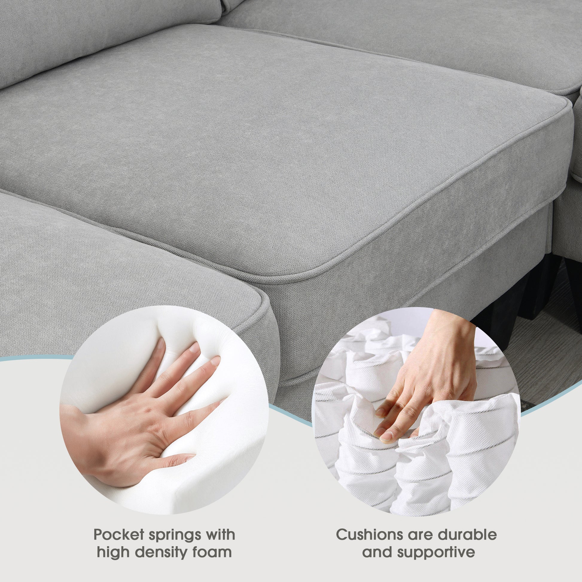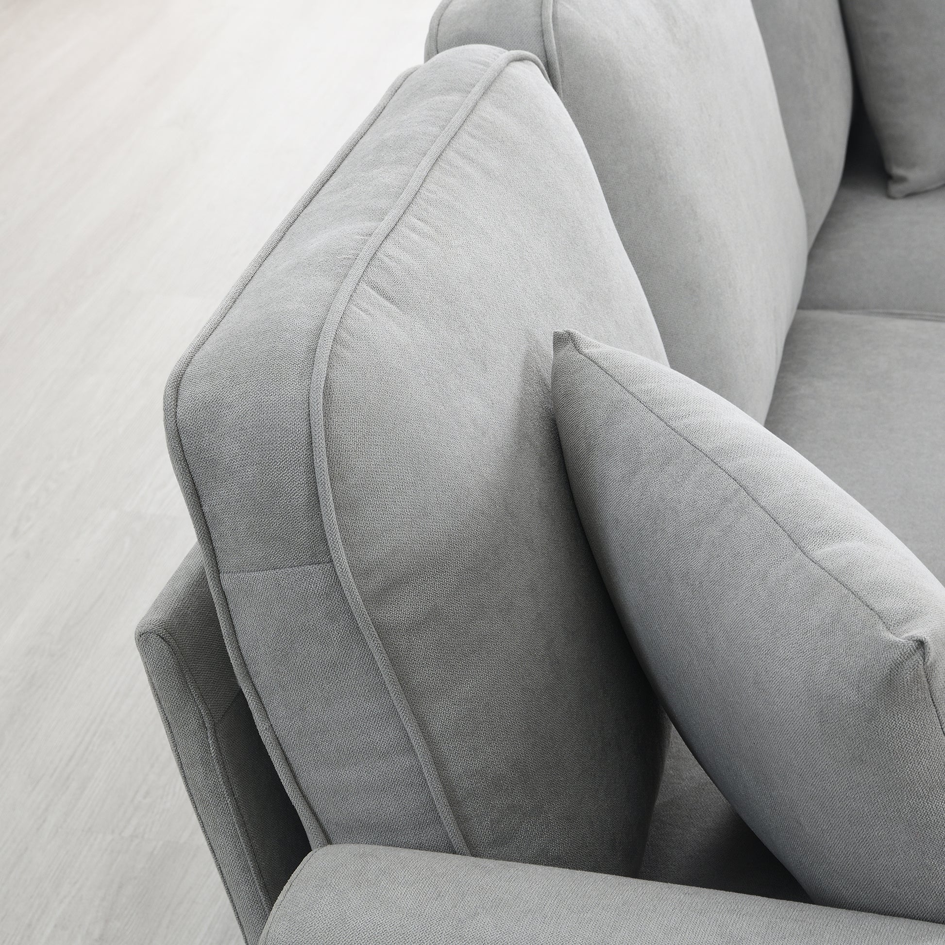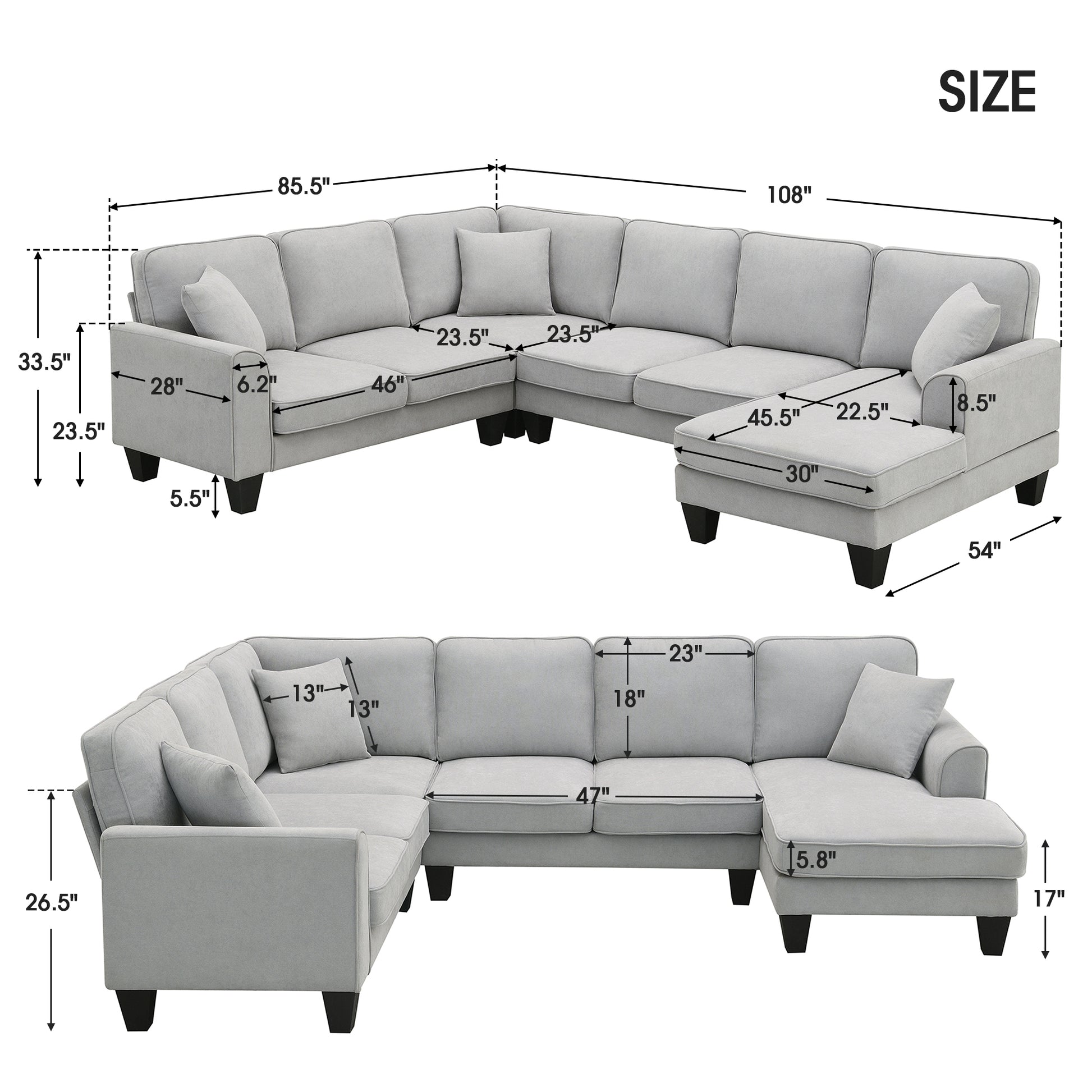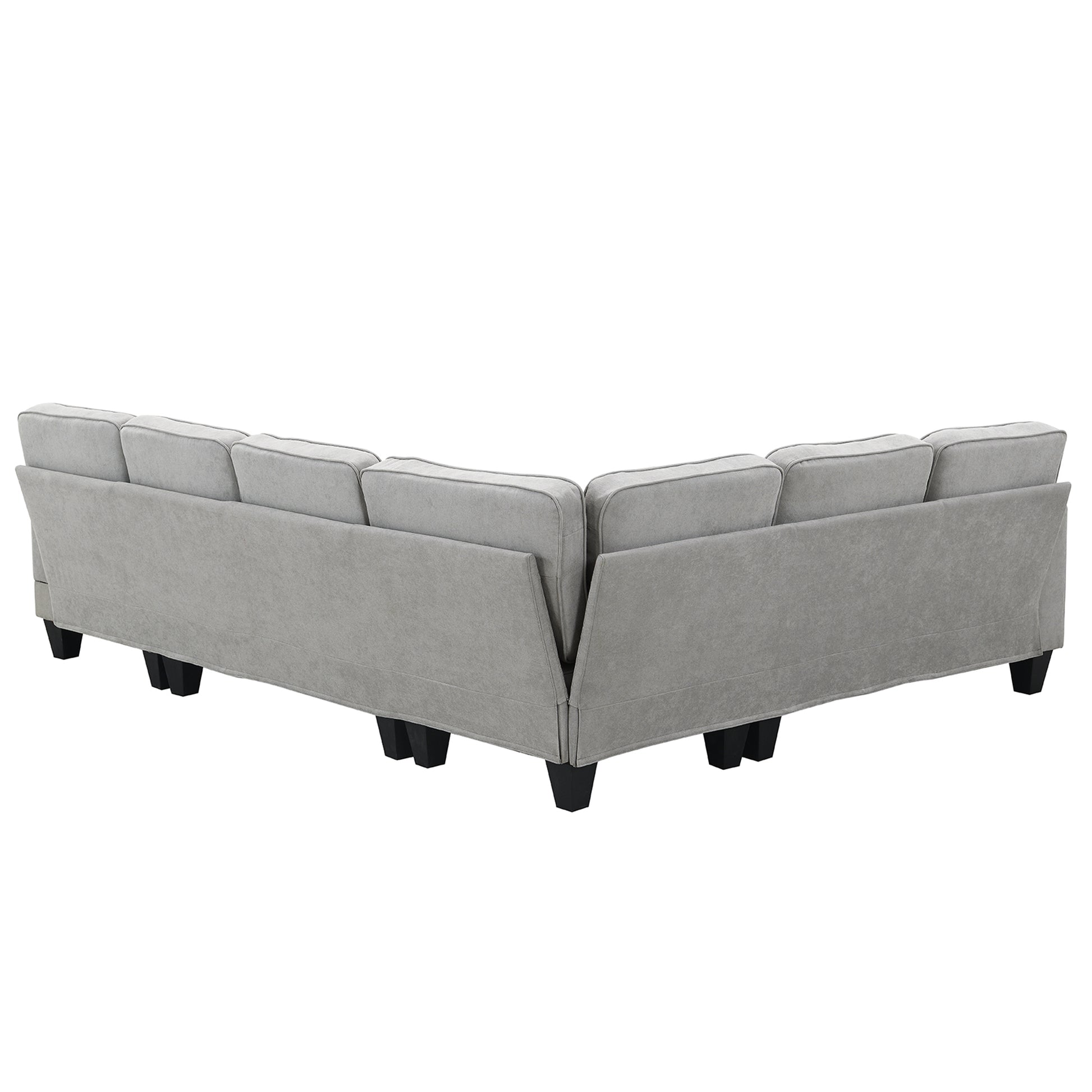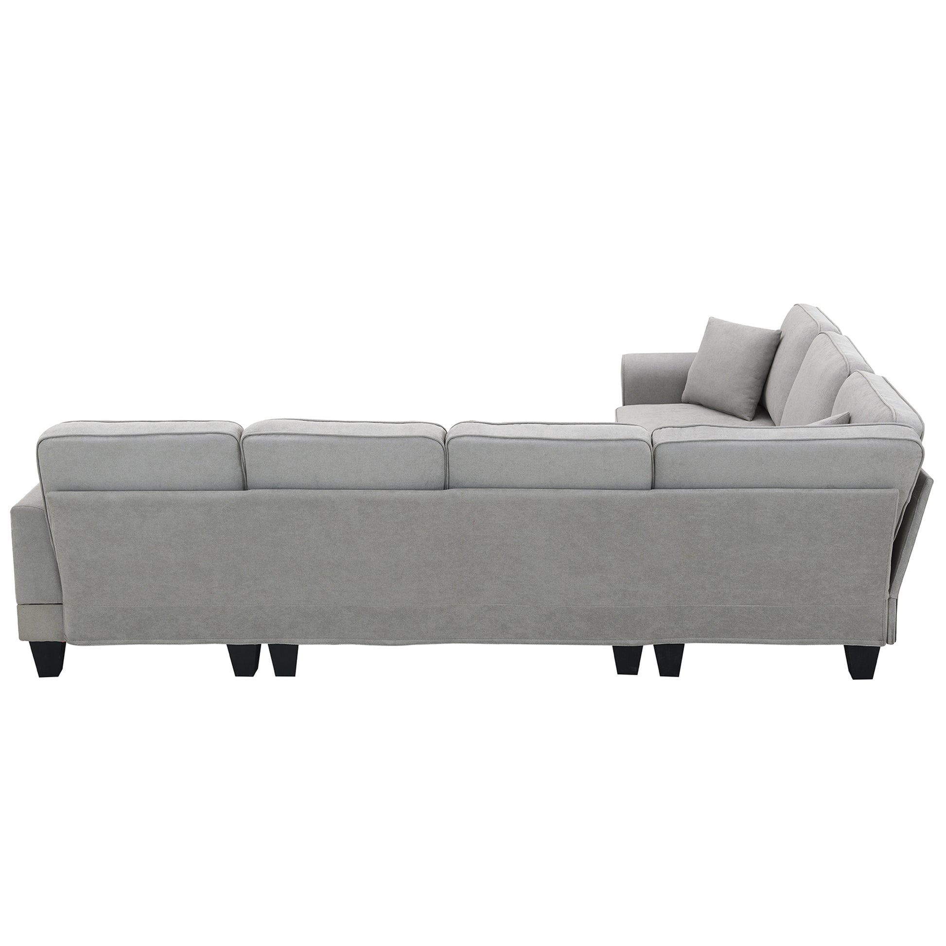 Elegante divano sezionale a forma di U da 7 posti in tessuto grigio chiaro. Design modulare componibile con struttura robusta in legno massello e ferro. Include 3 cuscini decorativi per comfort e stile superiori.